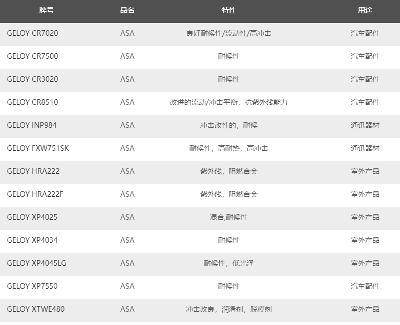 SABIC的GELOY是由丙烯酸-苯乙烯-丙烯腈的無形三元共聚物(ASA),主要性能為:耐候性、長久使用性、色彩穩(wěn)定性,良好的耐化學(xué)性,高耐熱性能和加工性能。