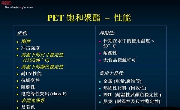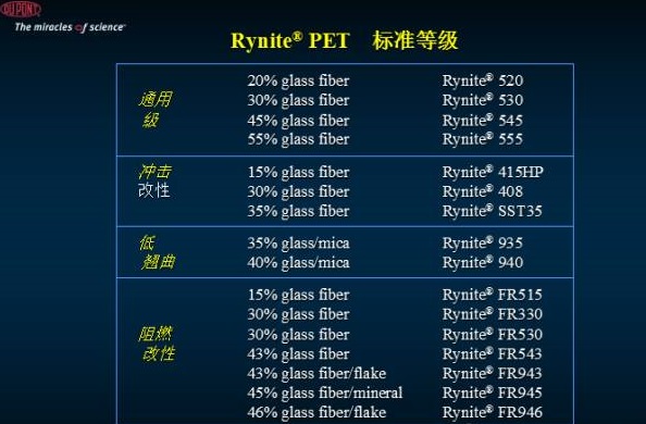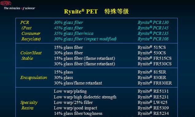 請注意杜邦的Rynite PET產品是全部為改性等級的,沒有非填充切片級材料: