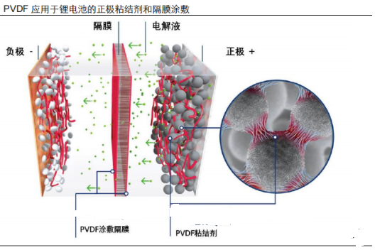 PVDF 在鋰電池中應(yīng)用于正極粘結(jié)劑和隔膜涂敷,適配鋰電池的工作環(huán)境主要得益于其優(yōu)質(zhì)的耐老化性、低介電損耗,以及在電極溶劑中的耐溶脹性。