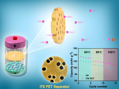 科研人員借助蘭州重離子研究裝置(HIRFL),將重離子輻照技術(shù)與化學蝕刻工藝相結(jié)合,以PET(聚對苯二甲酸乙二醇酯)膜為基材,開發(fā)出PET基耐高溫鋰離子電池隔膜。該鋰離子電池隔膜相較于商業(yè)聚烯烴隔膜,具有更加均一的孔徑分布和更優(yōu)異的電解液潤濕性,且所制備的PET隔膜表現(xiàn)出良好的耐高溫性能(熱收縮率小于3%@180℃)。電池測試結(jié)果表明,PET隔膜具有更高的鋰離子遷移數(shù)(0.59)以及優(yōu)異的常溫和高溫循環(huán)性能。