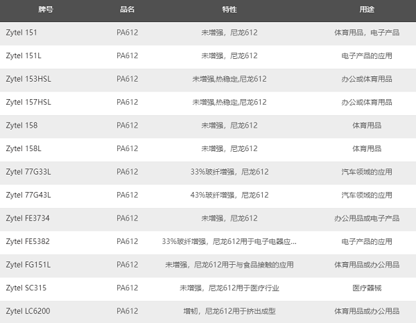 杜邦Zytel PA12 尼龍樹脂主要牌號如下: