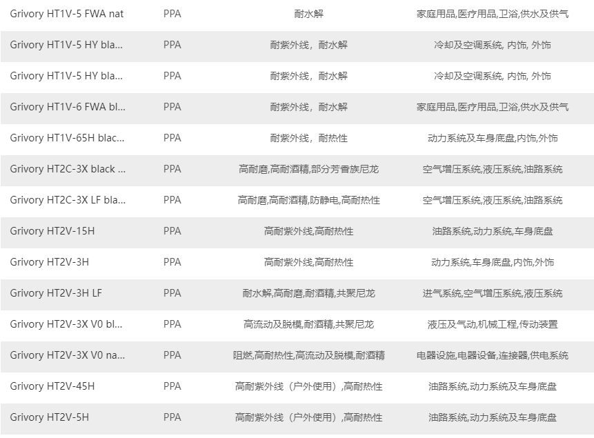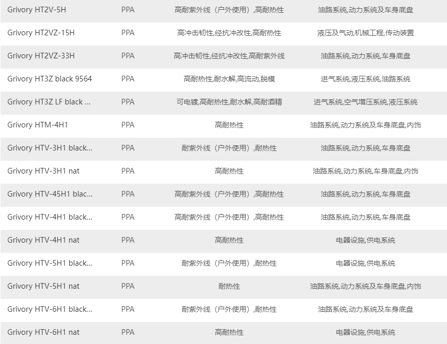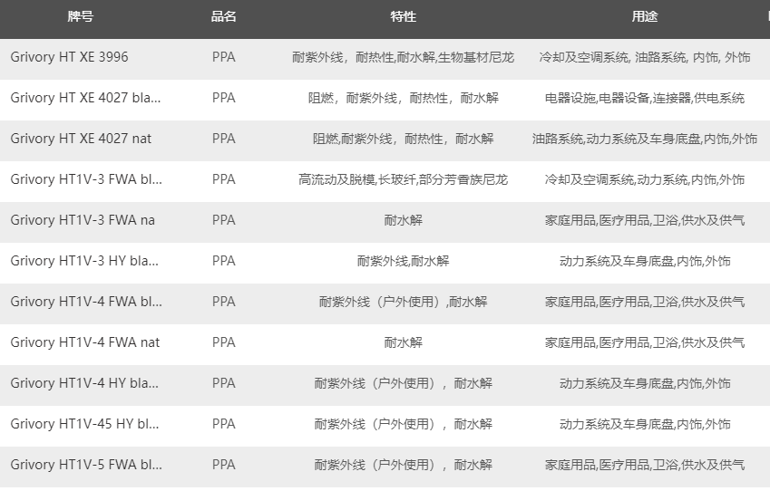 如何快速的找到需要瑞士-EMS Grivory HT PPA原料牌號(hào)?以下給提供是瑞士-EMS Grivory HT PPA塑料的原料牌號(hào)及其產(chǎn)品特性如下表。
