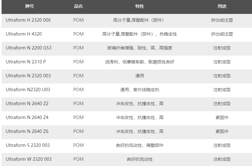 市售巴斯夫 Ultraform POM塑膠牌號列表如下: