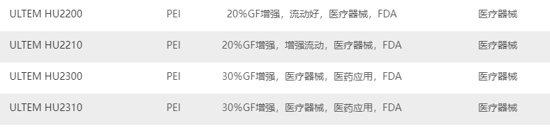 市售醫(yī)療級沙特-SABIC Ultem PEI 塑膠原料牌號列表如下