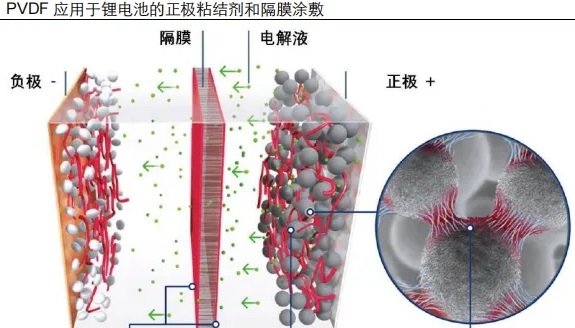 鋰電級PVDF 在鋰電池中應(yīng)用于正極粘結(jié)劑和隔膜涂敷,適配鋰電池的工作環(huán)境主要得益于其優(yōu)質(zhì)的耐老化性、低介電損耗,以及在電極溶劑中的耐溶脹性。