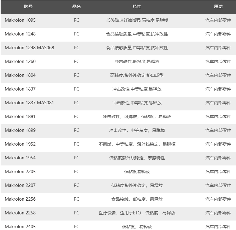 科思創(chuàng)Makrolon PC塑料應用于汽車內(nèi)部零件的牌號如下: