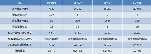 與純PA66相比,玻纖增強PA66機械強度、剛性、耐熱性、耐蠕變性和耐疲勞強度大幅度提高,伸長率、模塑收縮率、吸濕性下降。
