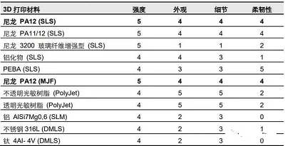 △3D 打印材料性能比較(以 5 分為滿分)。