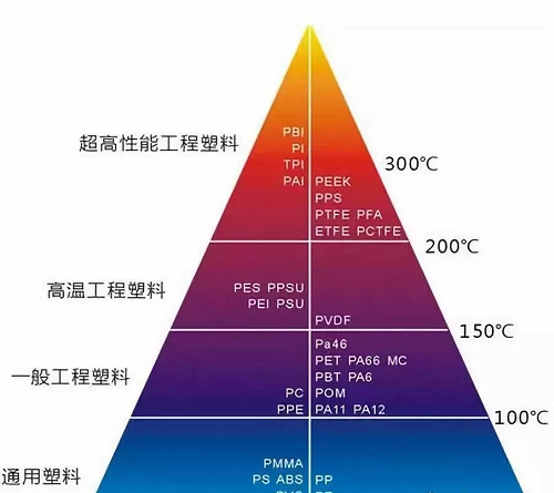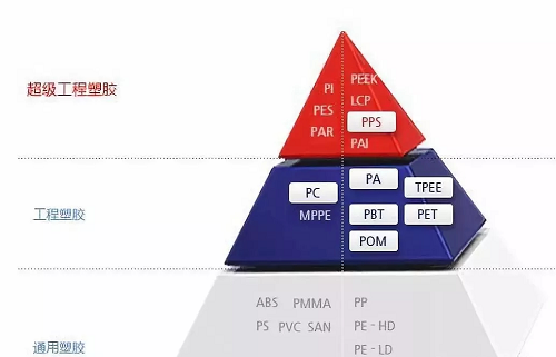 如下塑料金字塔透徹的說明了五大工程塑料的位置及地位