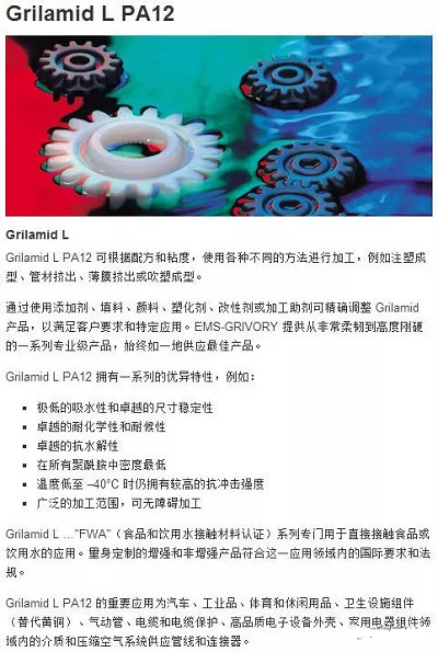 Grilamid PA12 產(chǎn)品具備獨特特性,例如:(1):極低的吸水性 較高的尺寸穩(wěn)定性 (2): 卓越的耐化學性和抗紫外線性能