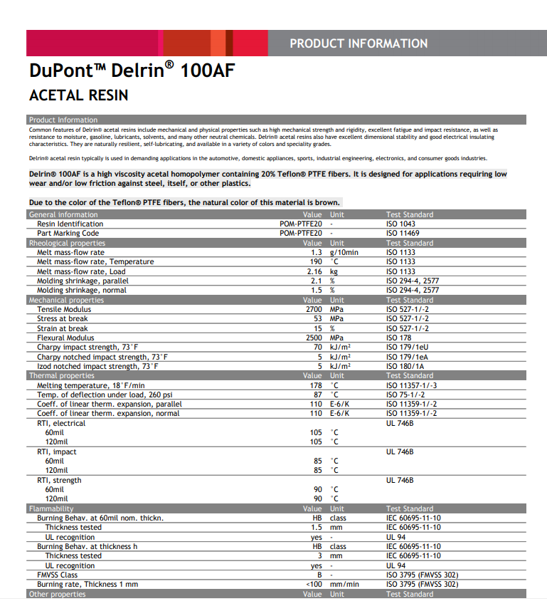 昊恩塑膠貿(mào)易有限公司為您提供詳細的 美國-杜邦 Delrin POM 100AF 物性表參數(shù)。
