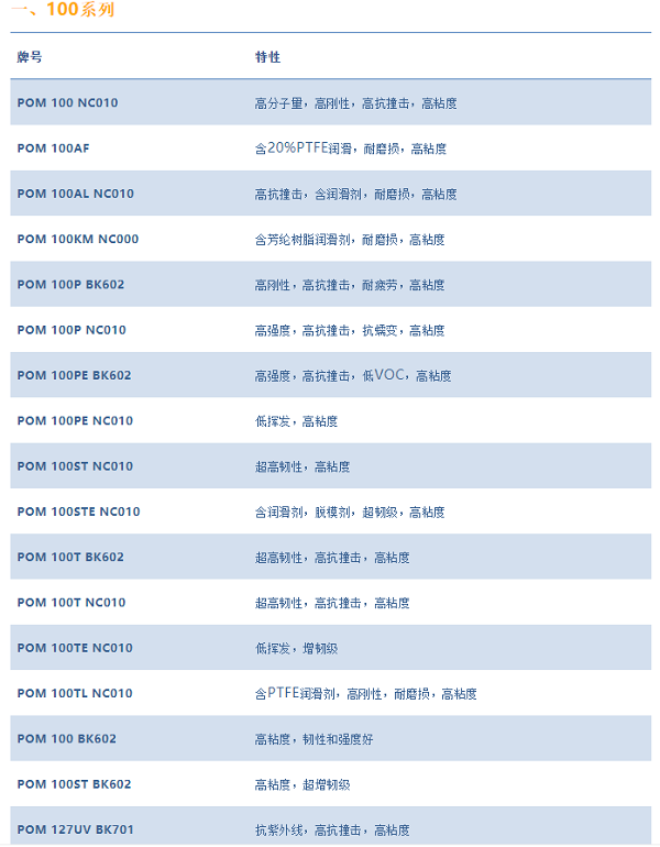 杜邦的聚甲醛主要是按照其粘度來分類的:產(chǎn)品的第一個數(shù)字近似代表其熔融指數(shù),所以按分類有100、300、500、900系列,其熔融指數(shù)隨數(shù)字變大而增大(熔融指數(shù)越大,粘度越小),如粘度比較:POM 100NC010>POM 300CP BK642>POM 500AF>POM 900P BK602。