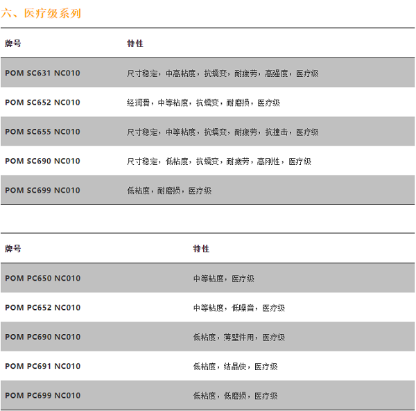 其次,杜邦的部分聚甲醛還按照其用途分類:FG食品級、SC醫(yī)療級、PC醫(yī)療級,SC和PC應該是有差別的。