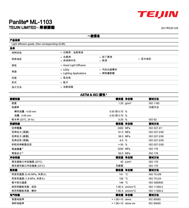 PC原料帝人Panlite ML-1103物性指標(biāo):
