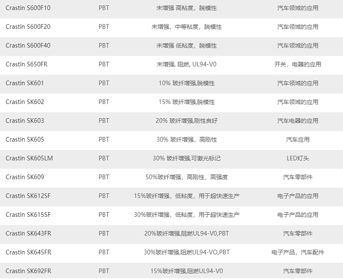 杜邦 Crastin? PBT產(chǎn)品系列的主要牌號(hào)