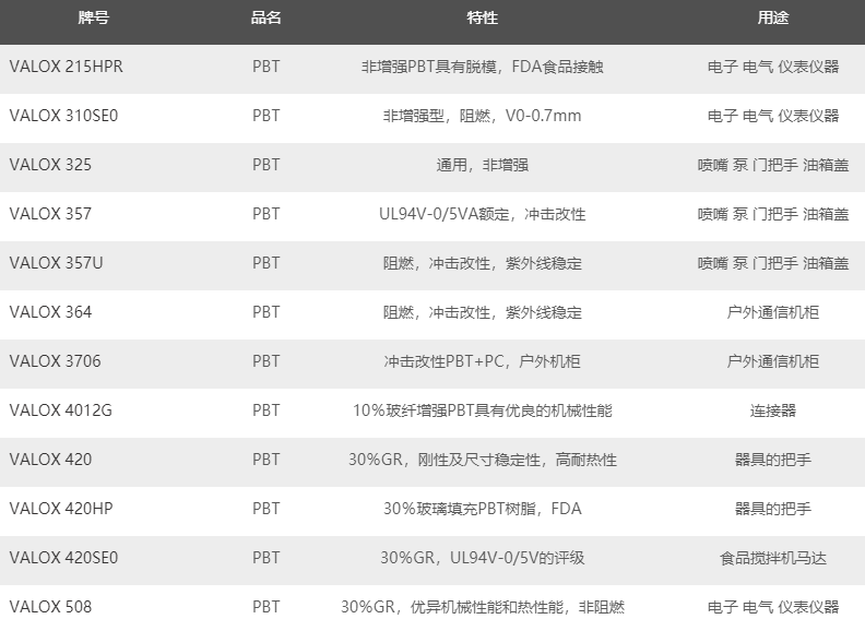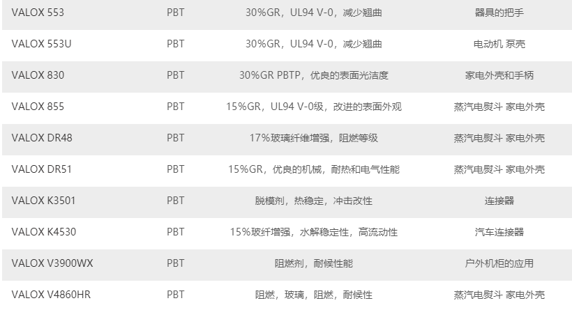 沙特-SABIC Valox PBT塑料主要牌號(hào)及用途: