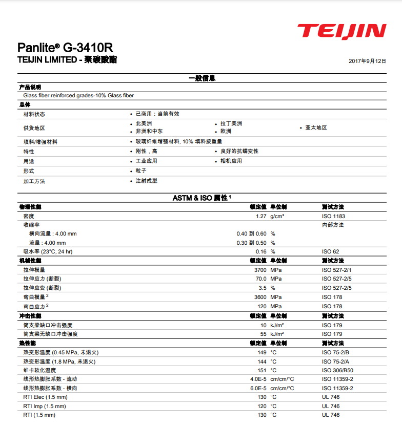 日本-帝人塑料Panlite G-3410R物性表參數(shù):