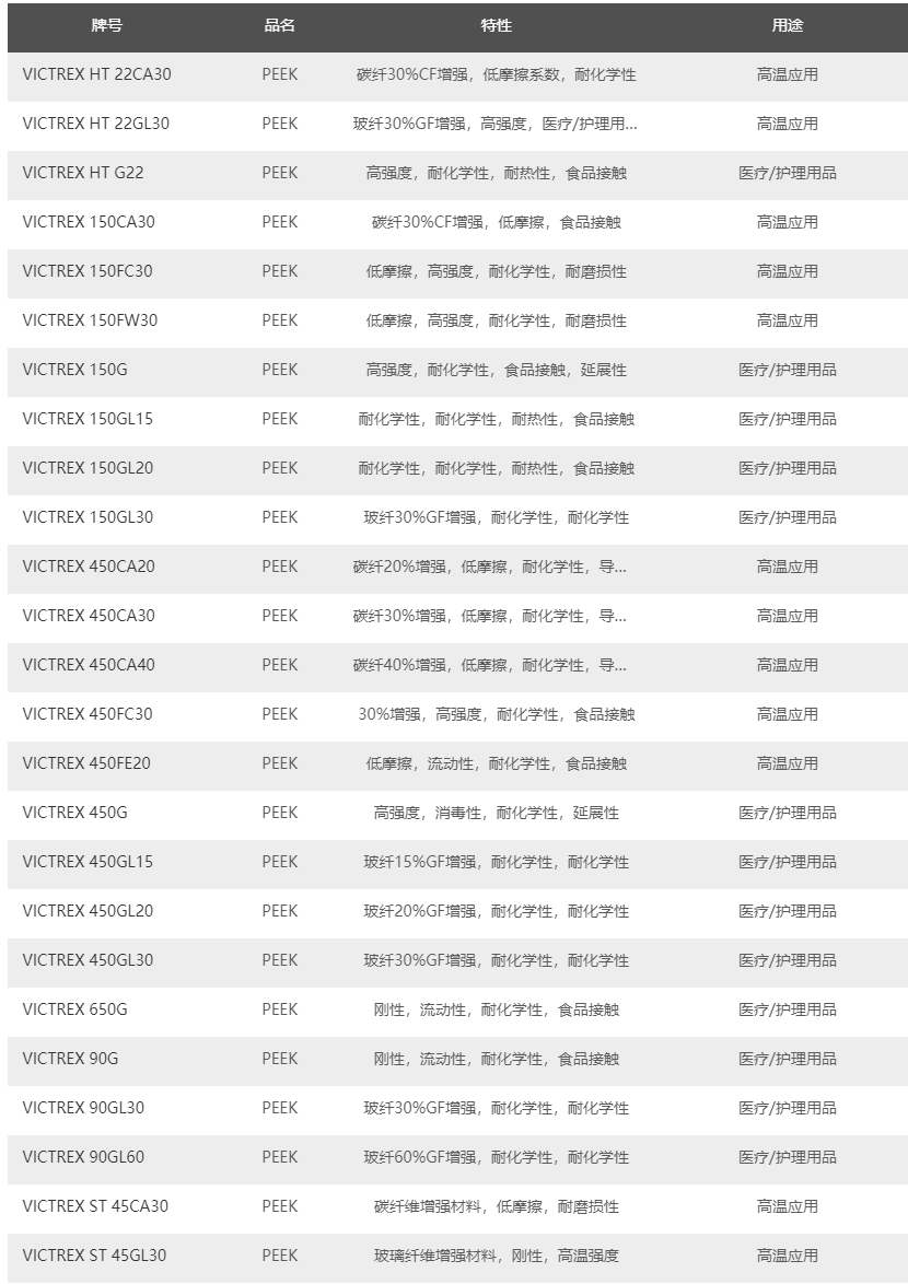 英國(guó)-威格斯 VICTREX PEEK牌號(hào)及物性應(yīng)用