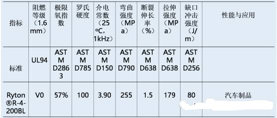 比利時索維爾公司收購了美國菲利普公司的PPS生產(chǎn)線,成為了全球最大的PPS生產(chǎn)商之一。下面以其牌號為Ryton@R-4-200BL的PPS產(chǎn)品為例,簡單介紹其產(chǎn)品主要性能。Ryton?R-4-200BL是填充玻纖40%的PPS產(chǎn)品,密度為1.68g/cm,成型收縮率在0.2-0.5%,吸水率為0.02%。