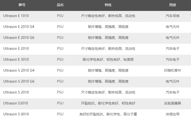 巴斯夫 Ultrason PSU主要牌號及性能應用