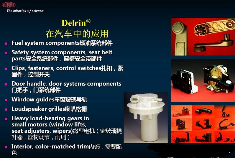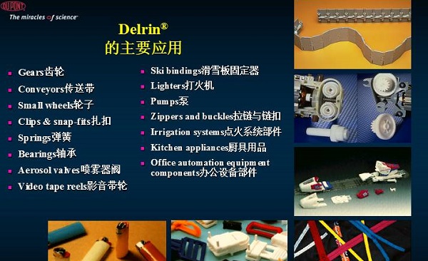 Delrin?聚甲醛樹脂由杜邦在 50年代末期發(fā)明. 如下是聚甲醛POM材料的典型應(yīng)用: