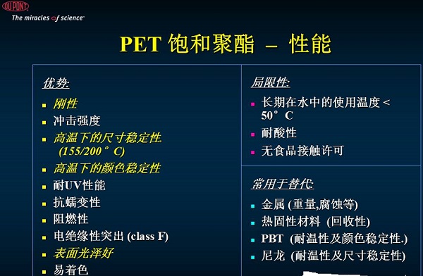 作為飽和聚酯的代表材料,PET有著比較大的優(yōu)勢(shì),如高溫穩(wěn)定性,表面光澤度高等,但缺點(diǎn)也很明顯,如不耐熱水(使用溫度須低于50℃),詳細(xì)如下圖:
