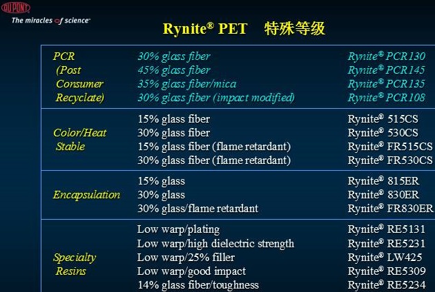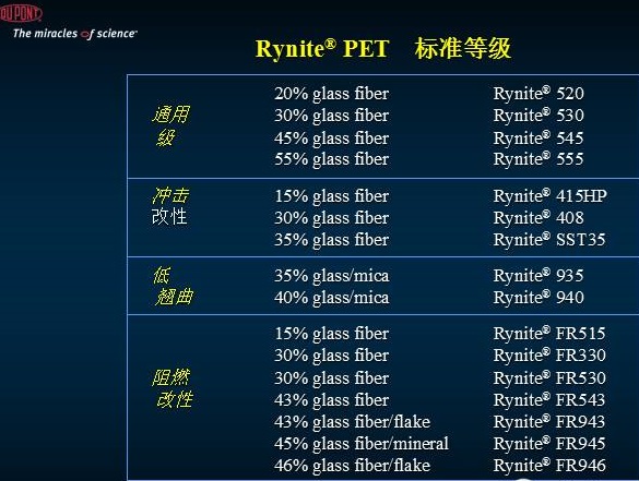 杜邦的Rynite PET產(chǎn)品是全部為改性等級(jí)的,沒有非填充切片級(jí)材料: